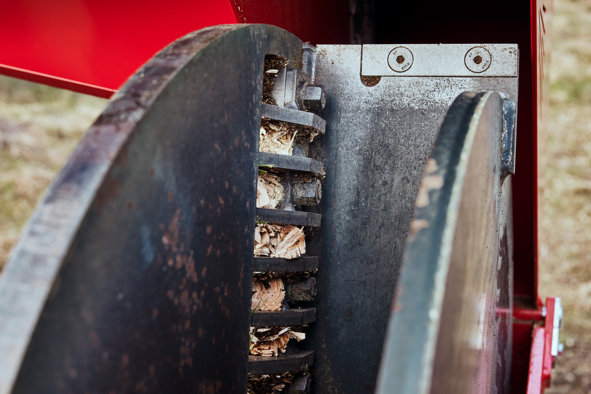 - Den store rotorskive med tre knive i kombination med tre modstål, 90 graders huggevinkel og to vandrette indtræksvalser sikrer meget effektiv flishugning